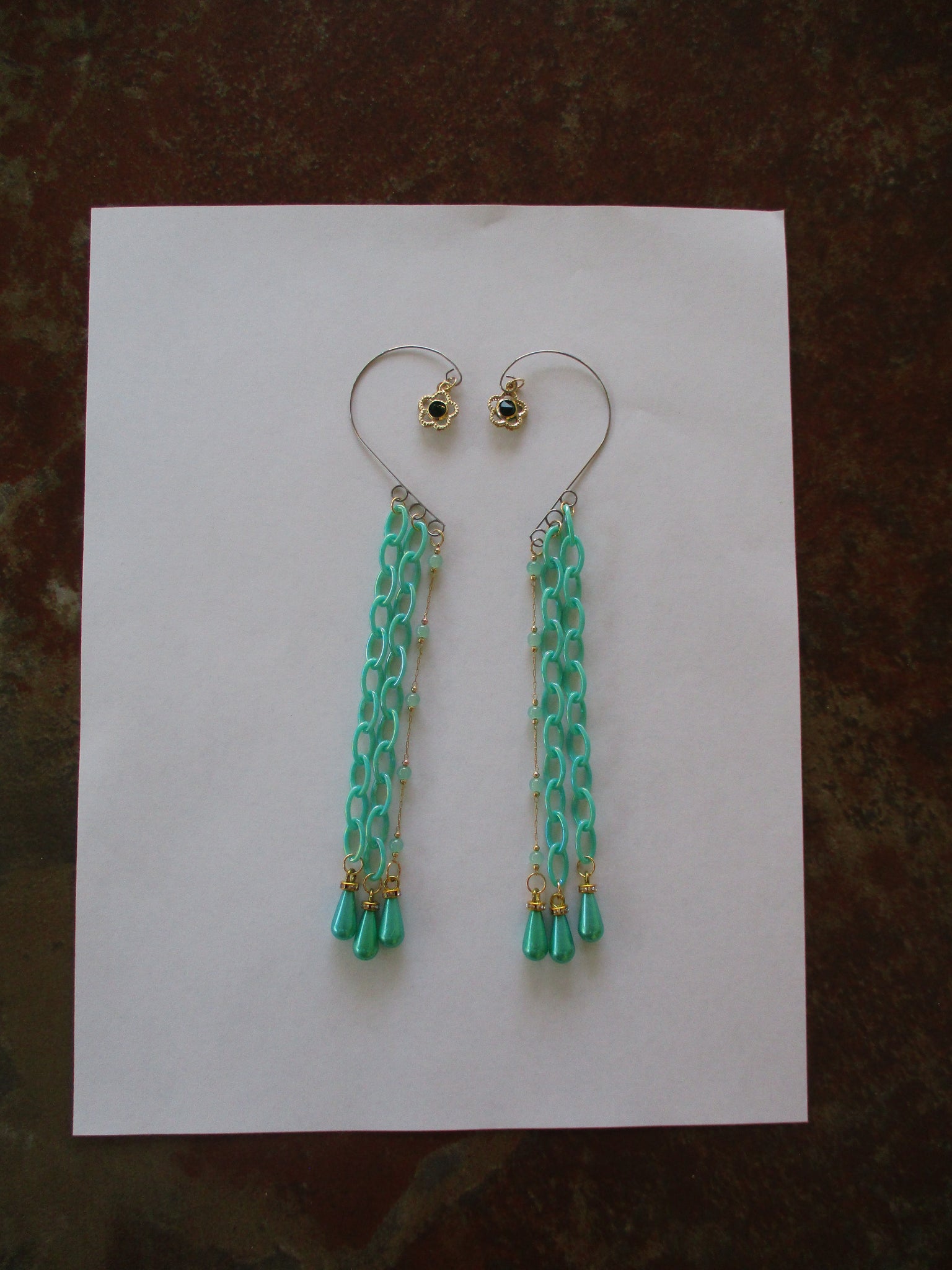 Green Chain Gold Green Glass Bead Chain Green Tear Drop Pearls Flower Beads Ear Cuffs (EC177)