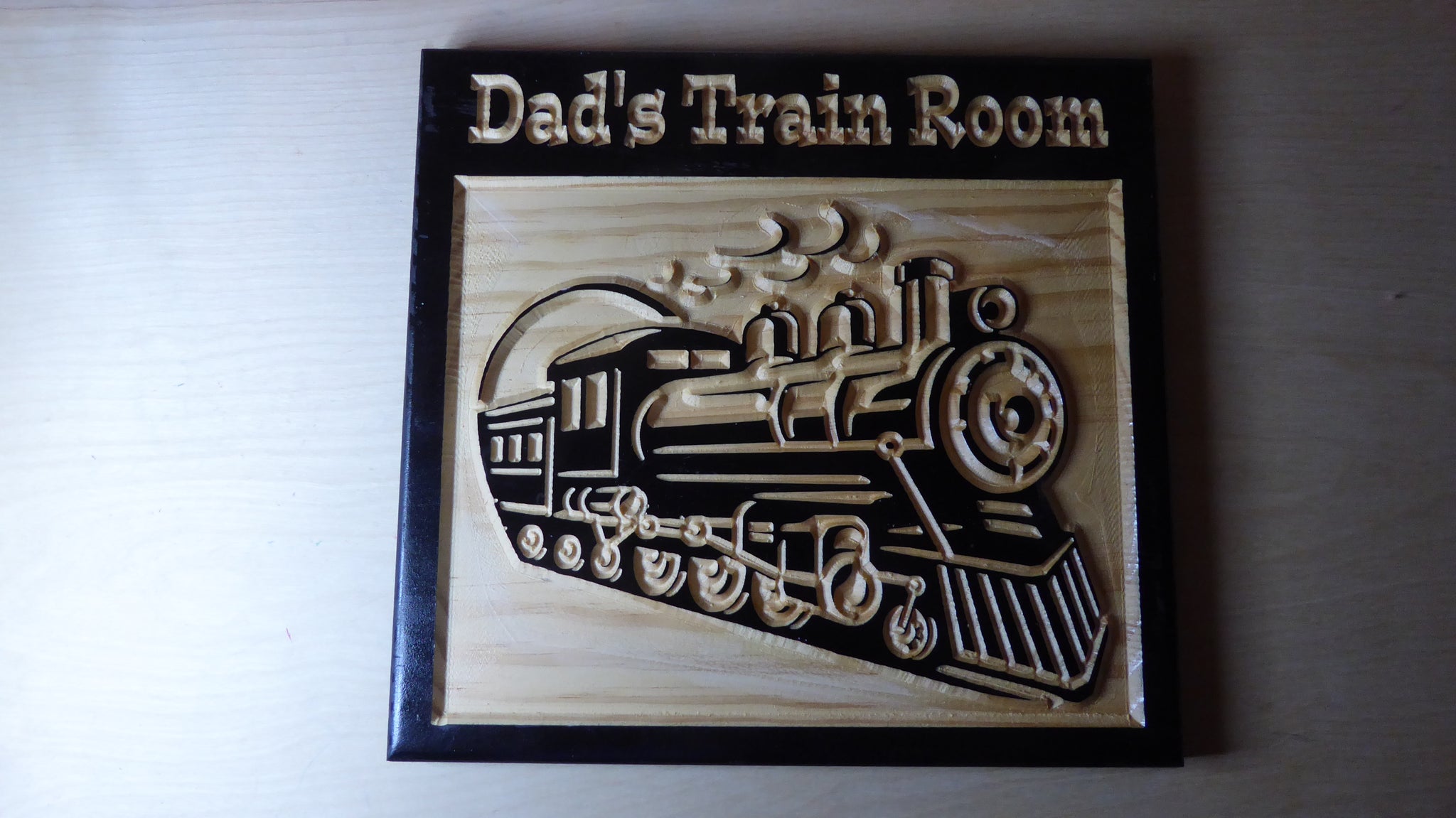 A CNC carved wood sign in pine. The sign measures 11.25 inches tall by 12 inches wide, and is 3/4 inch thick. The back of the sign has two keyholes, which allow it to be hung on a wall using a standard picture frame hanger. This makes it easy to display the sign in any location.