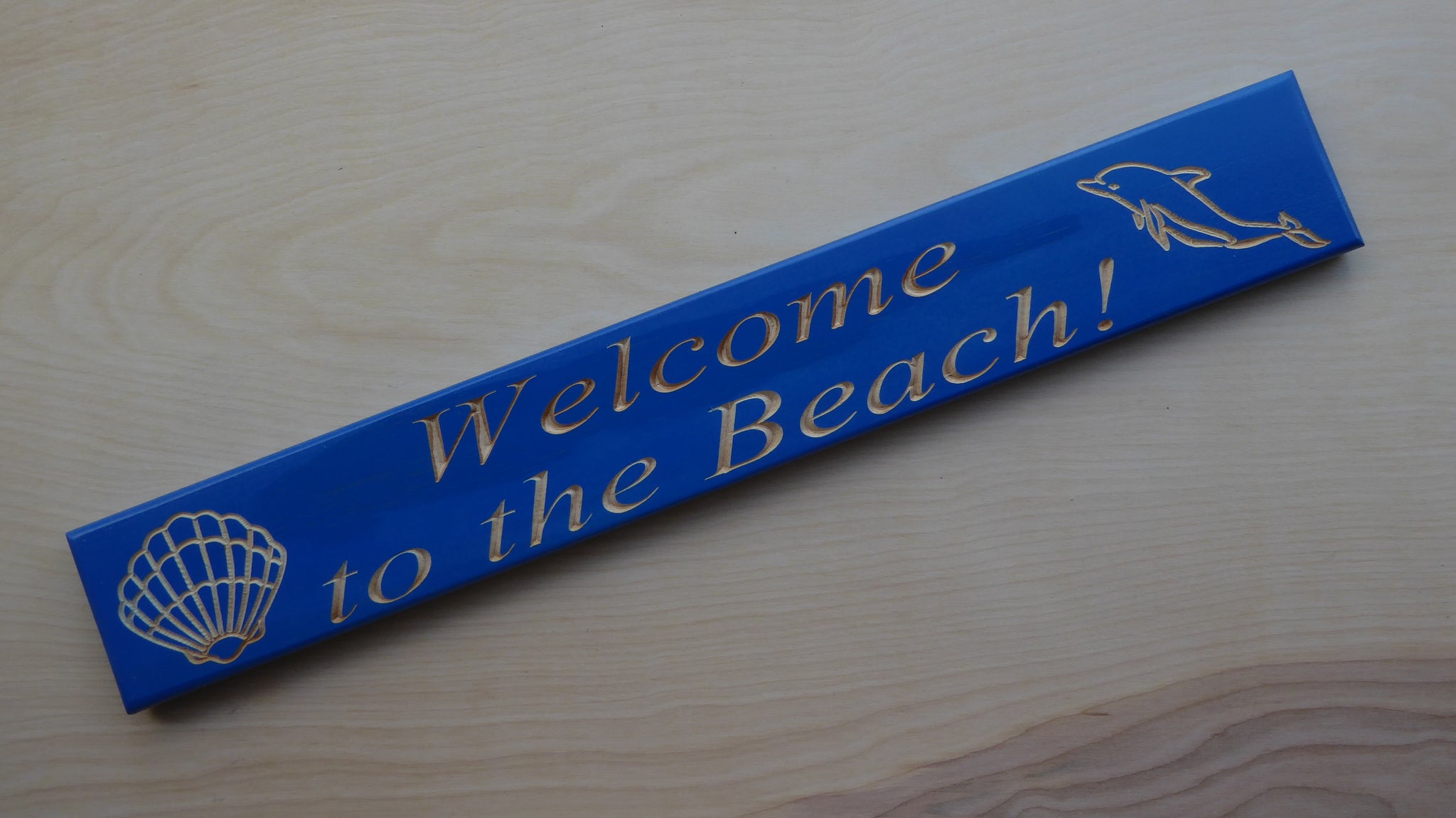 A 3.5 inch tall by 24 inch wide 3/4 inch thick carved wood sign. The back of the sign has keyholes for easy hanging.Type: 3.5 by 24 inch sign