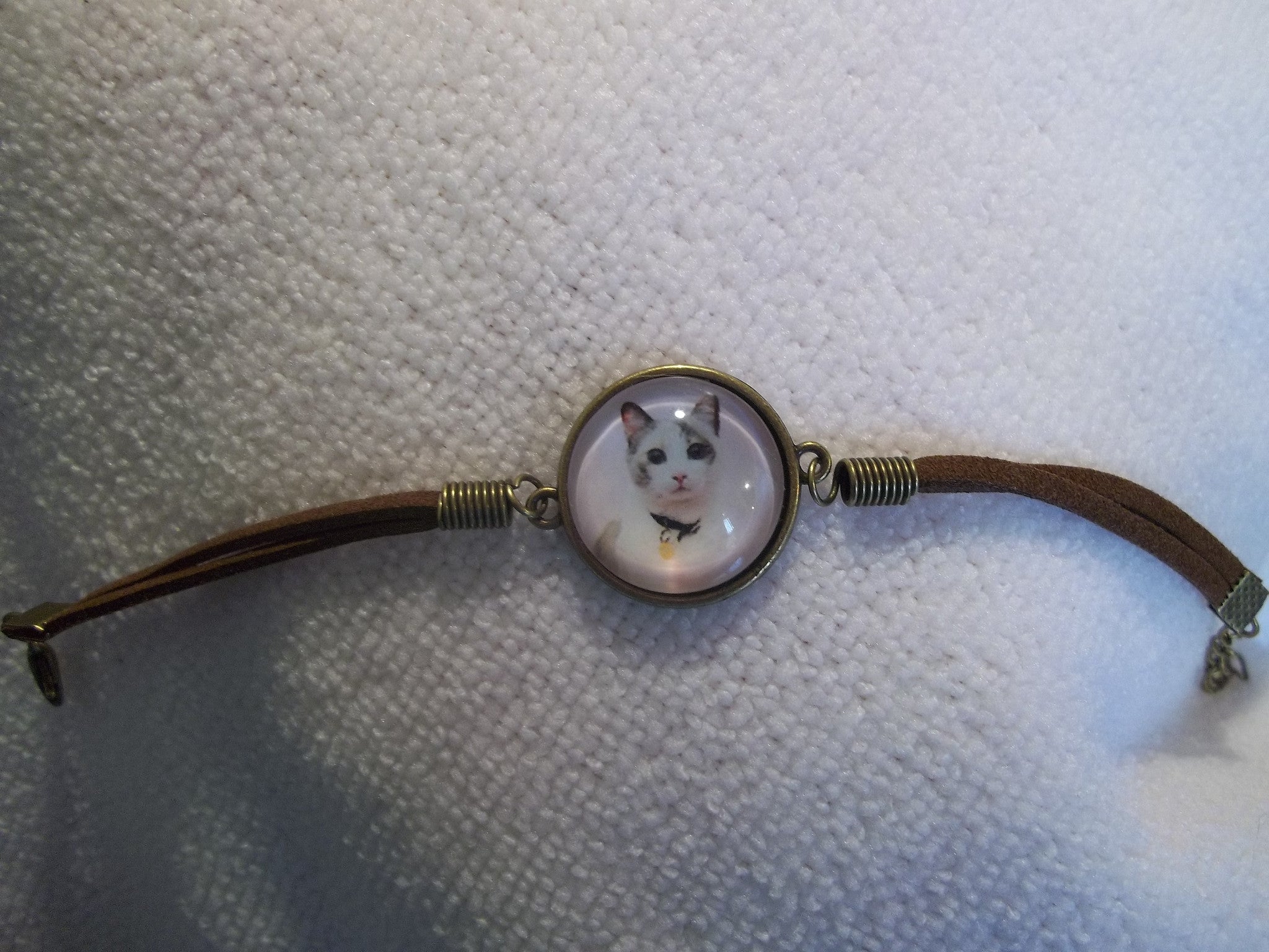 Bronze Brown Leather Bubble White Cat Bracelet (B408)