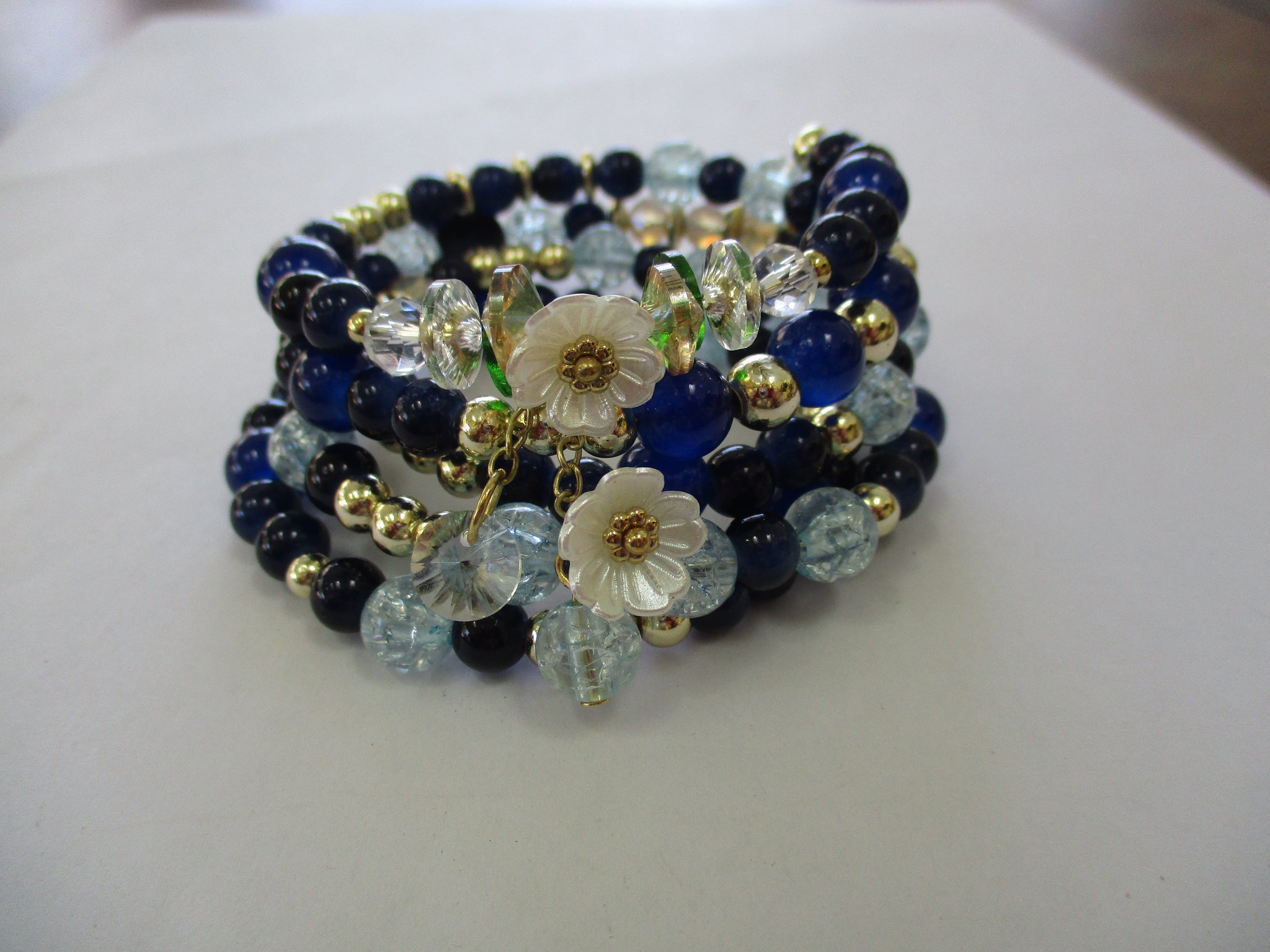 Dark Blue, Blue, Silver Beads Flower Charms Memory Wire Bracelet (B647)