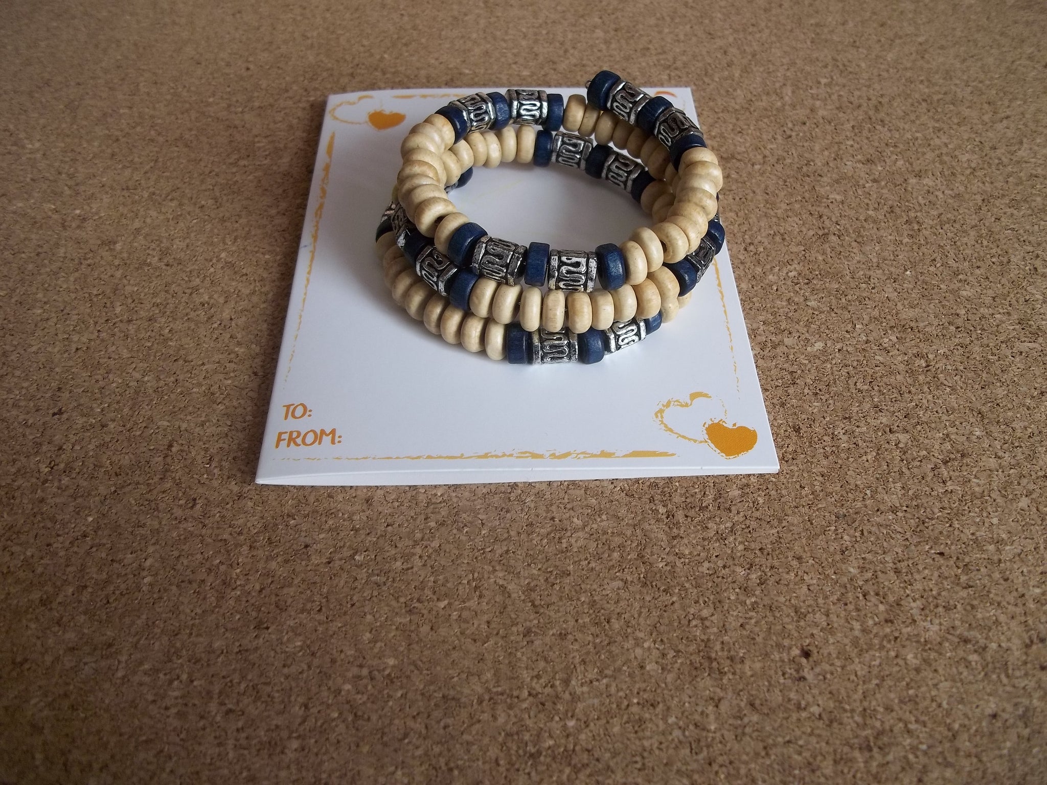 Memory Wire Tan Dark Blue Wooden Beads Bracelet (B487)