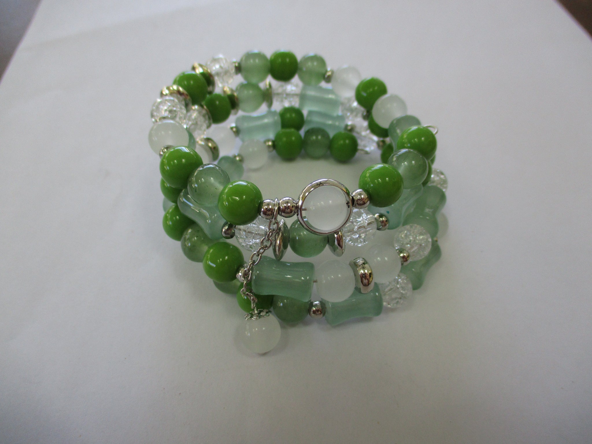 Mutli green, Clear, Silver Beads, Bead Dangle Charm Memory Wire Bracelet (B655)