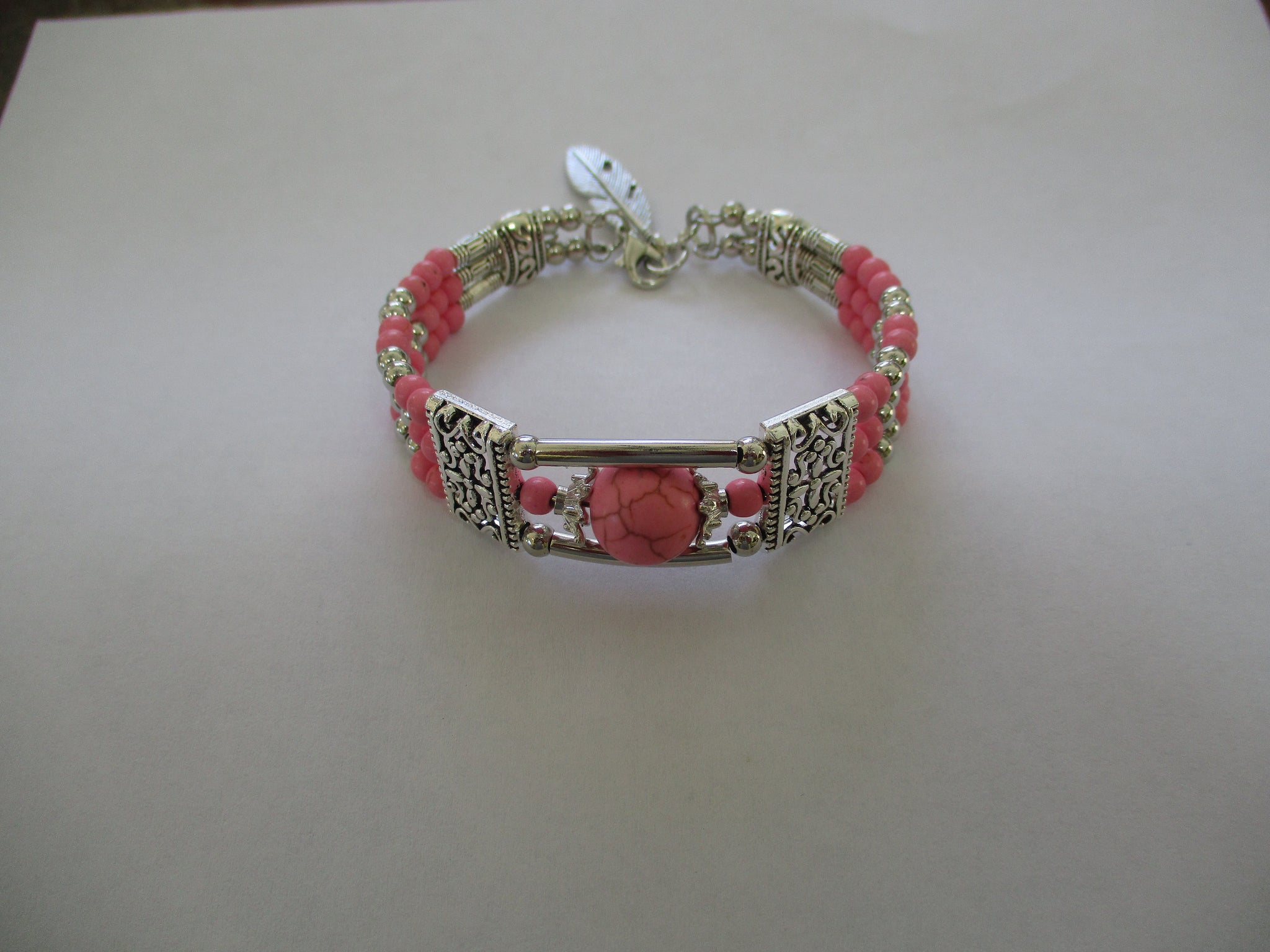 Pink Beads, Silver Beads, Silver Tubes, Memory Wire Bracelet (B707)