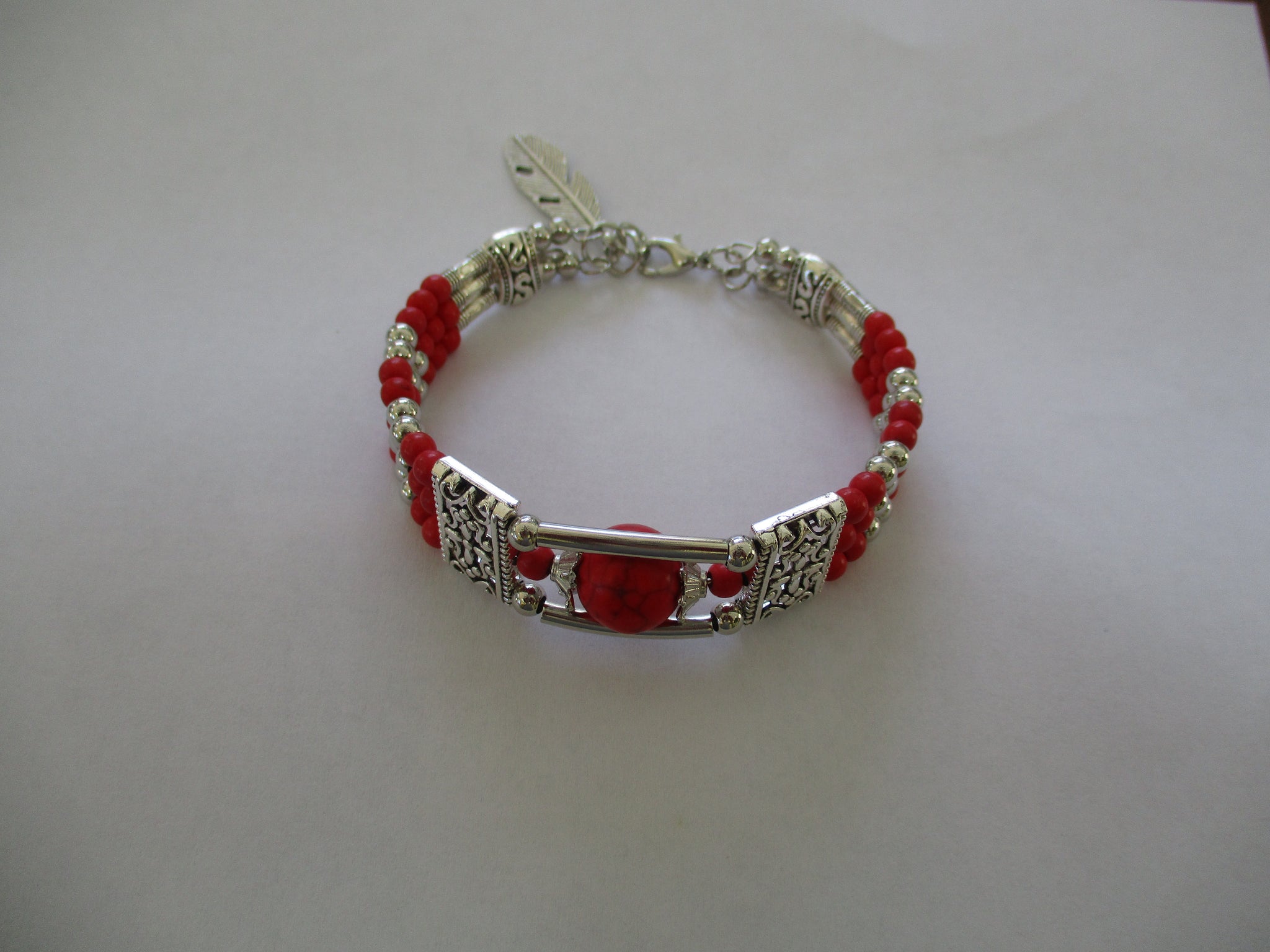 Red Beads, Silver Spacer Beads, Memory Wire Bracelet (B704)