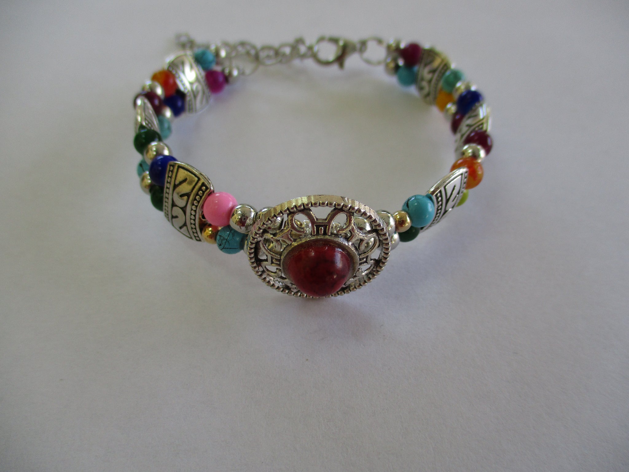 Silver Multi Color Beads with Button Charm Memory Wire Bracelet (B597)