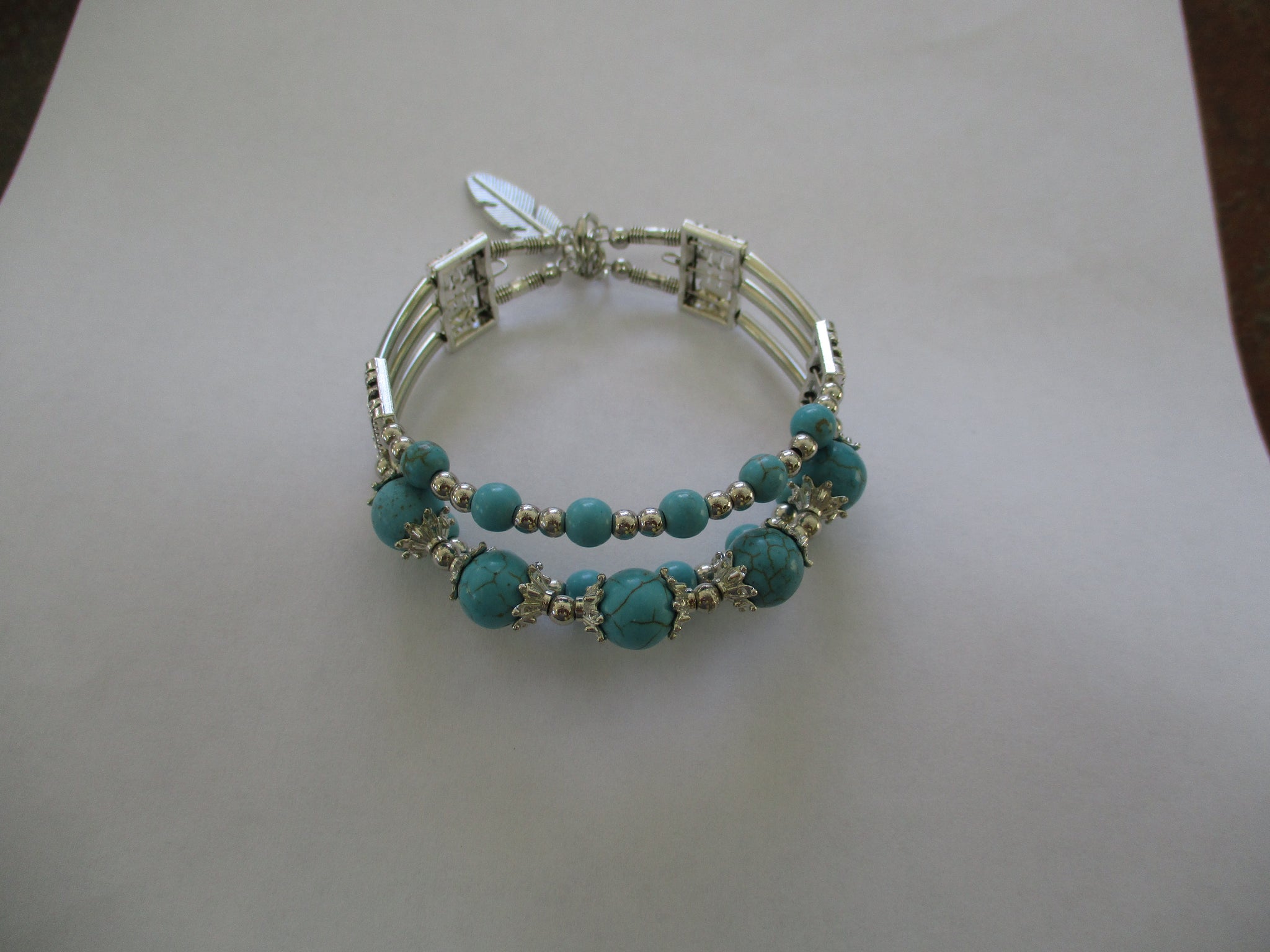 Turquoise Beads, Silver Beads, Silver Tubes, 3 Rows, Memory Wire Bracelet (B697)