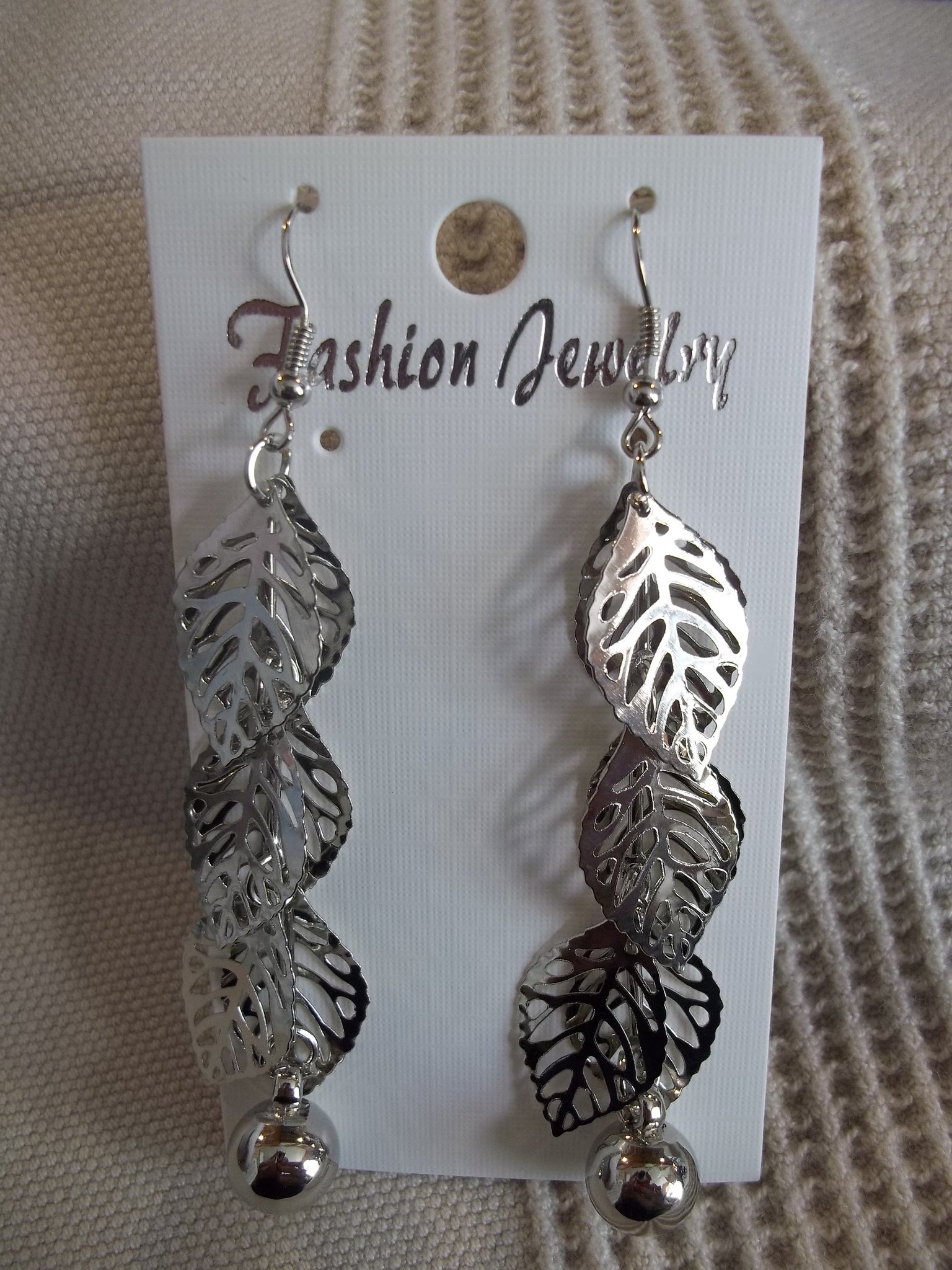 Silver Leaf Silver Bead Long Earrings (E942)