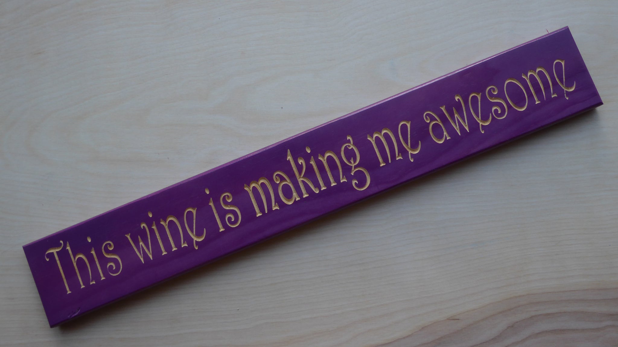 A 3.5 inch tall by 24 inch wide 3/4 inch thick carved wood sign. The back of the sign has keyholes for easy hanging.