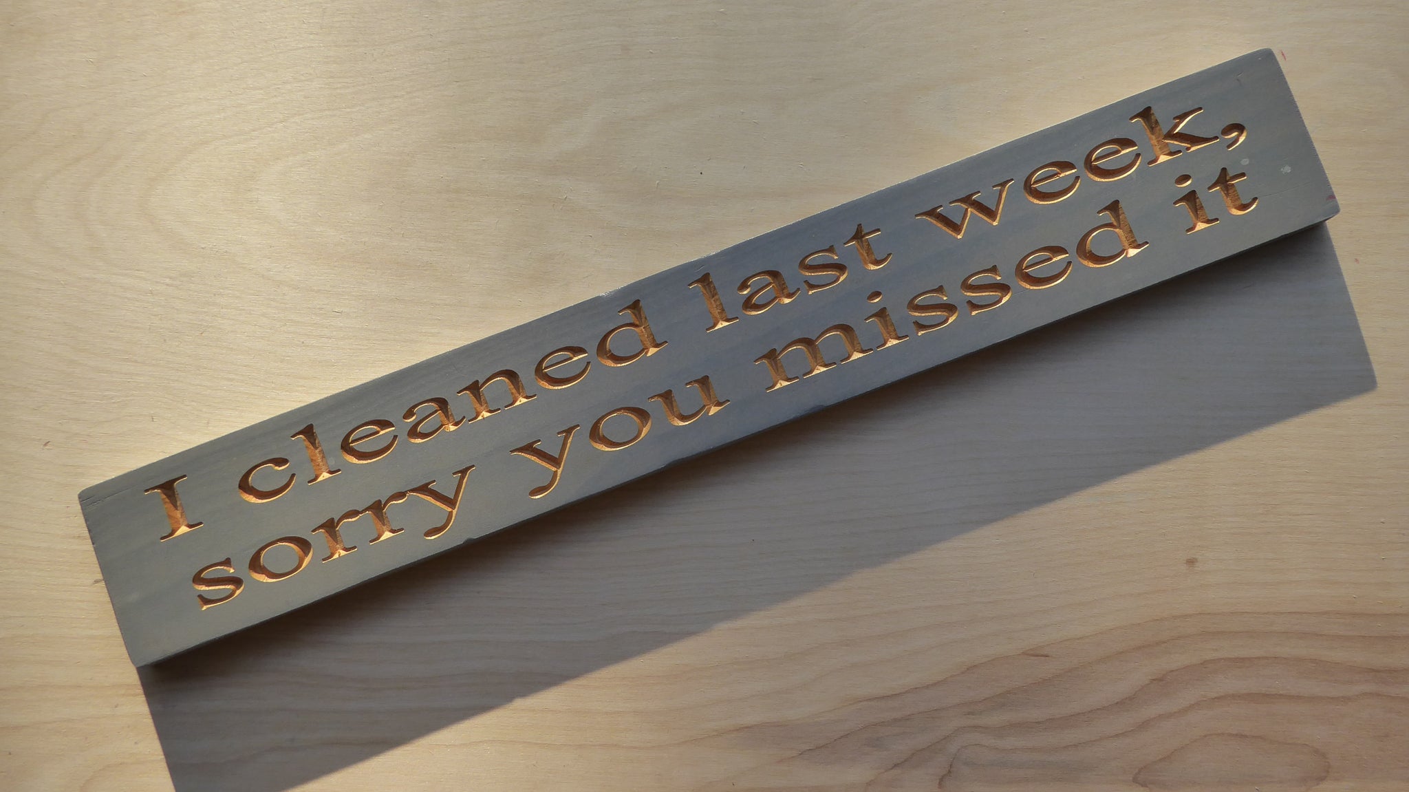 A 3.5 inch tall by 24 inch wide 3/4 inch thick carved wood sign. The back of the sign has keyholes for easy hanging.