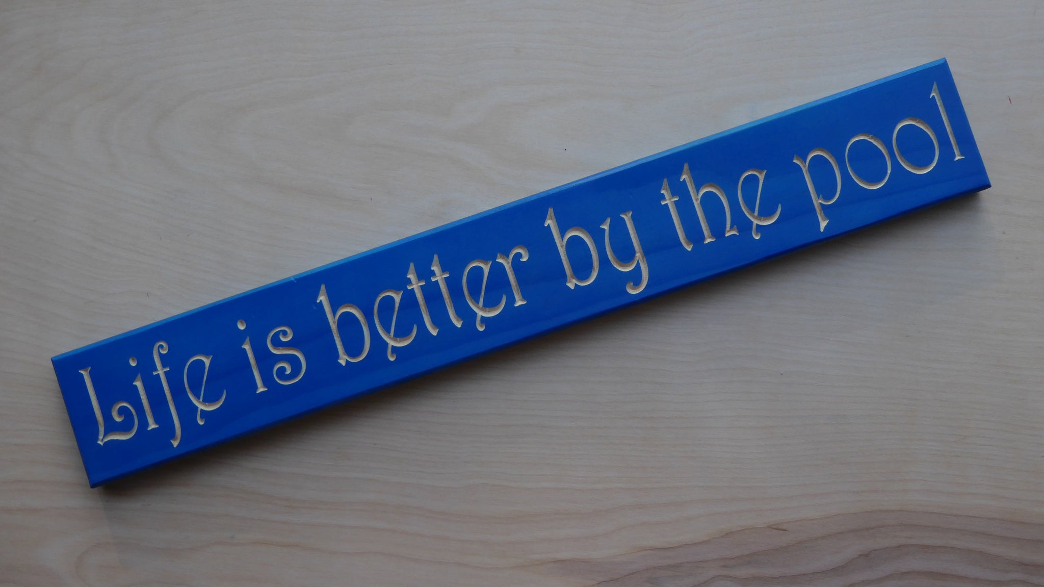 A 3.5 inch tall by 24 inch wide 3/4 inch thick carved wood sign. The back of the sign has keyholes for easy hanging.