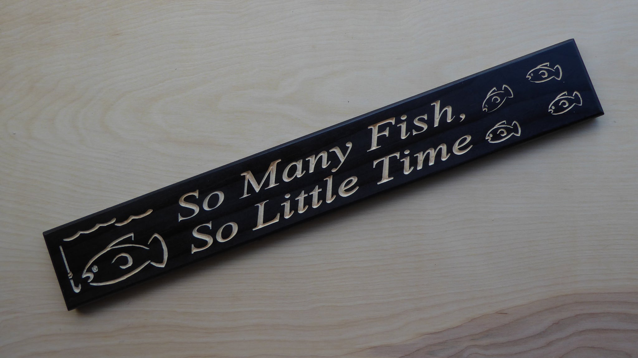 A 3.5 inch tall by 24 inch wide 3/4 inch thick carved wood sign. The back of the sign has keyholes for easy hanging.