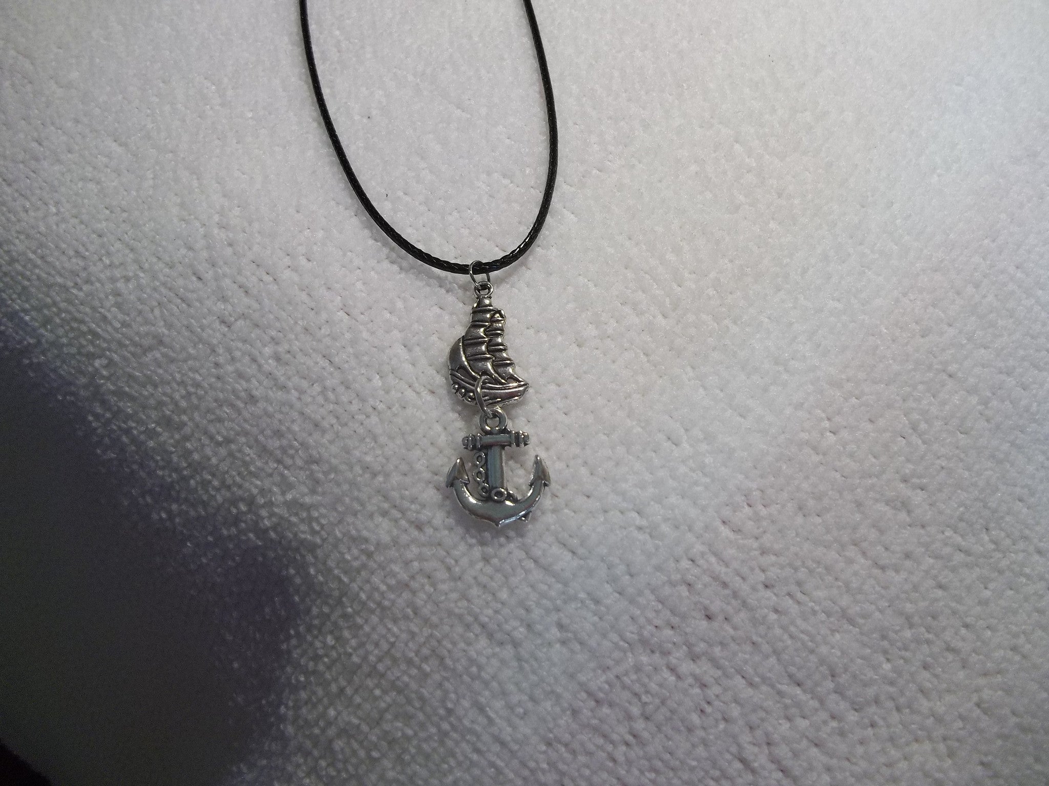 Black Leather Silver Tall Ship w/ Silver Anchor Necklace (N307)
