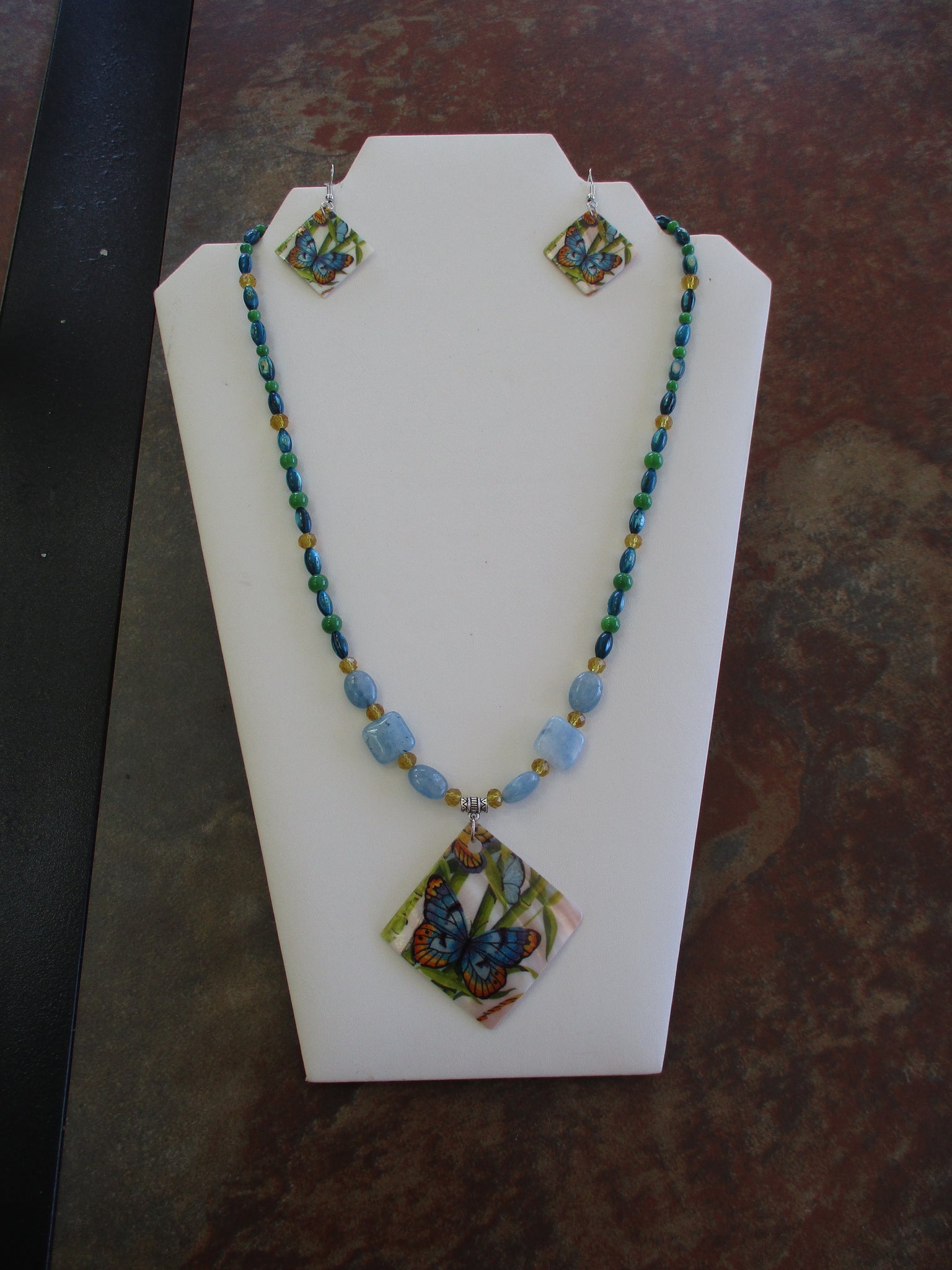 Blue Green Gold Glass Beads Butterflies Painted On Shell Pendant Necklace Earring Set (NE516)