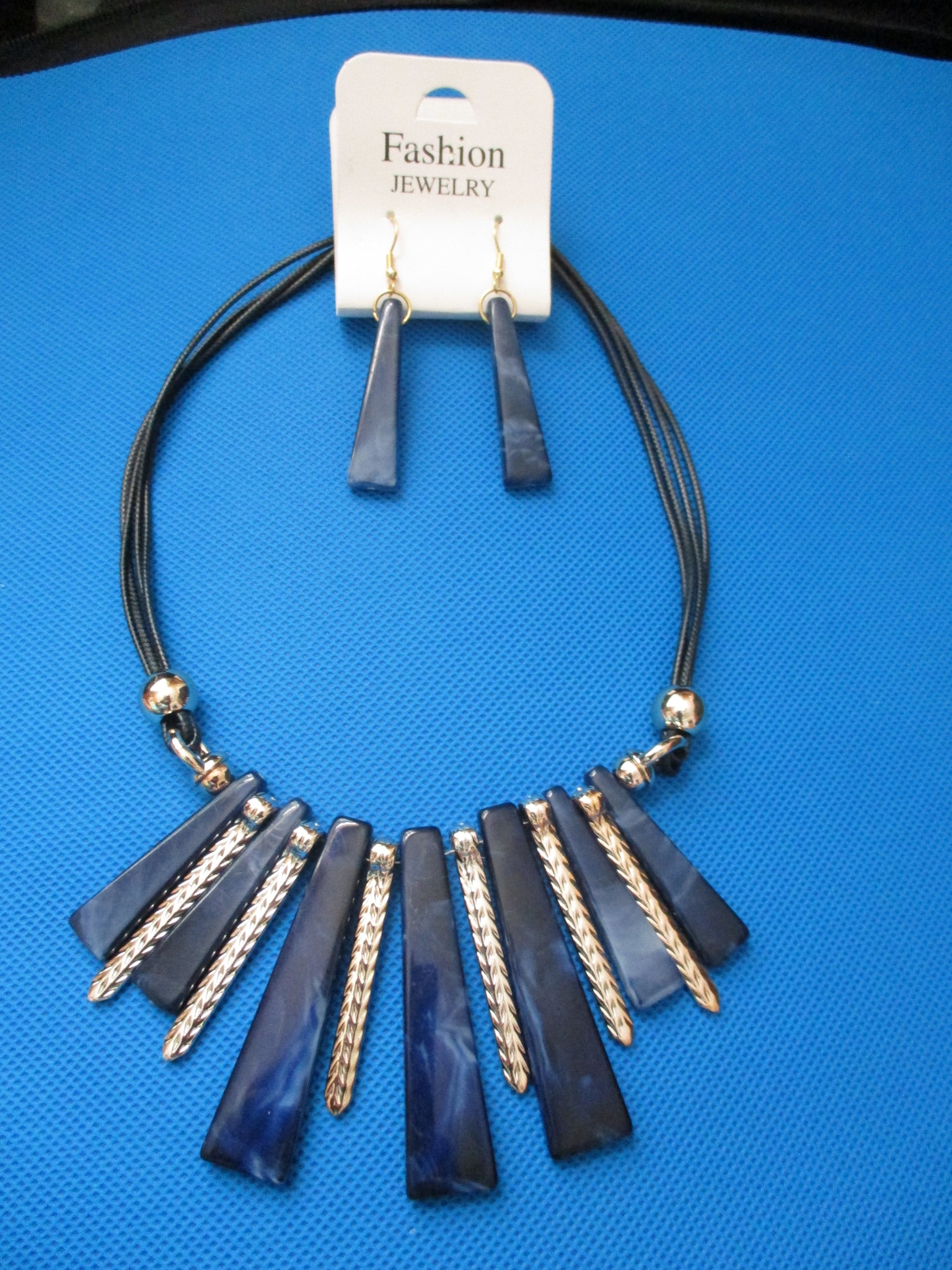 Black Cord Blue Gold Long Flat Beads Necklace Earrings Set (NE468)