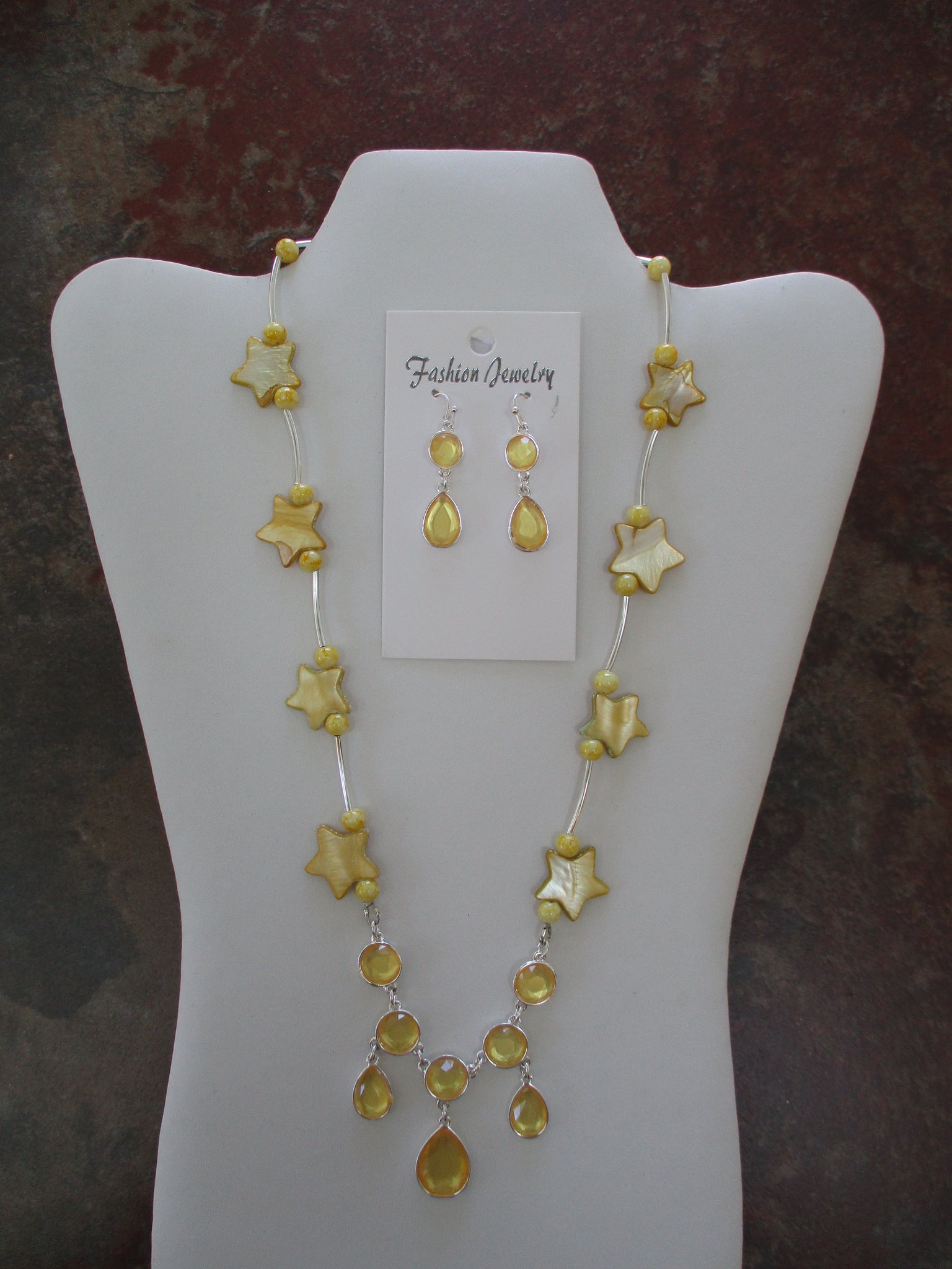 Yellow Mother of Pearl Star Shell Beads, Silver Yellow Tear Drop Pendants Necklace Earrings Set (NE484)