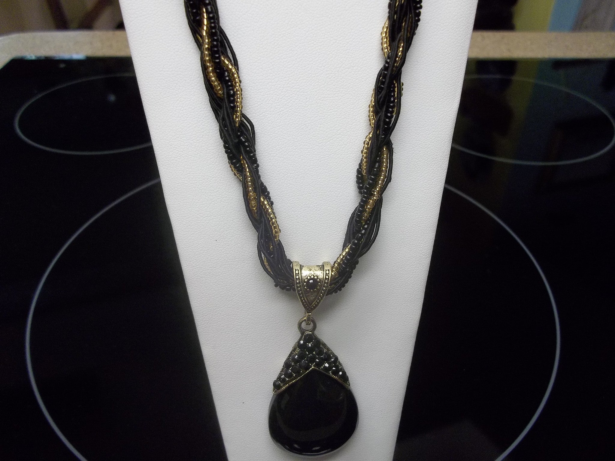 Black Braided Glass Tear Drop Necklace (N419)