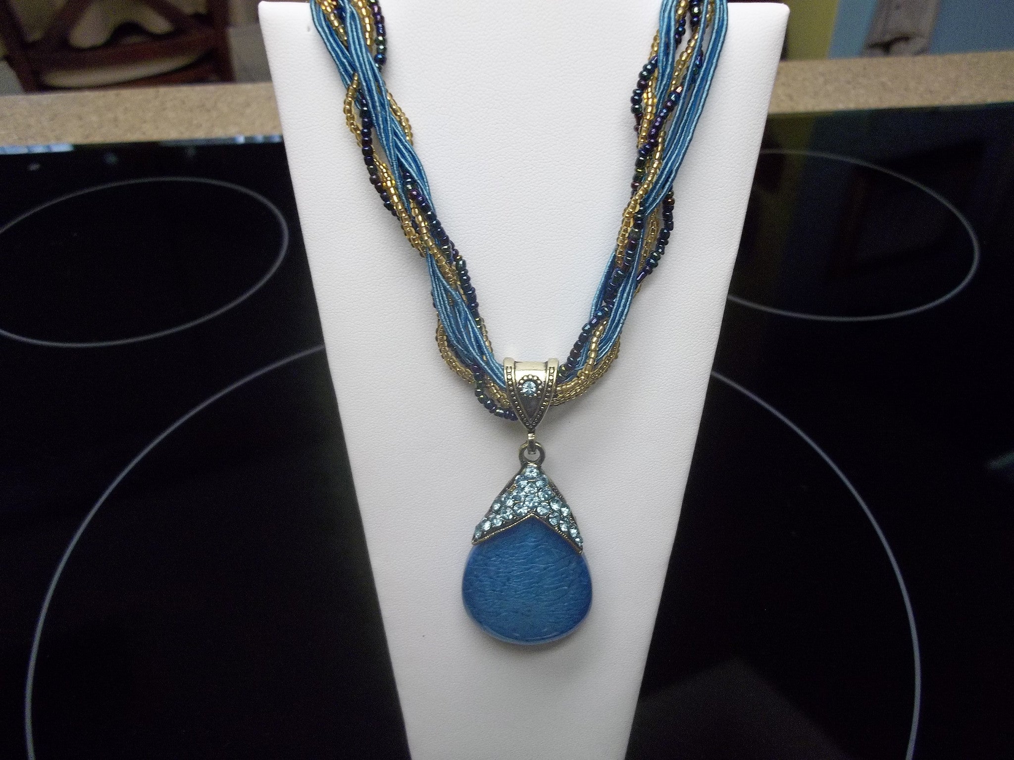 Blue Braided Glass Tear Drop Necklace (N421)