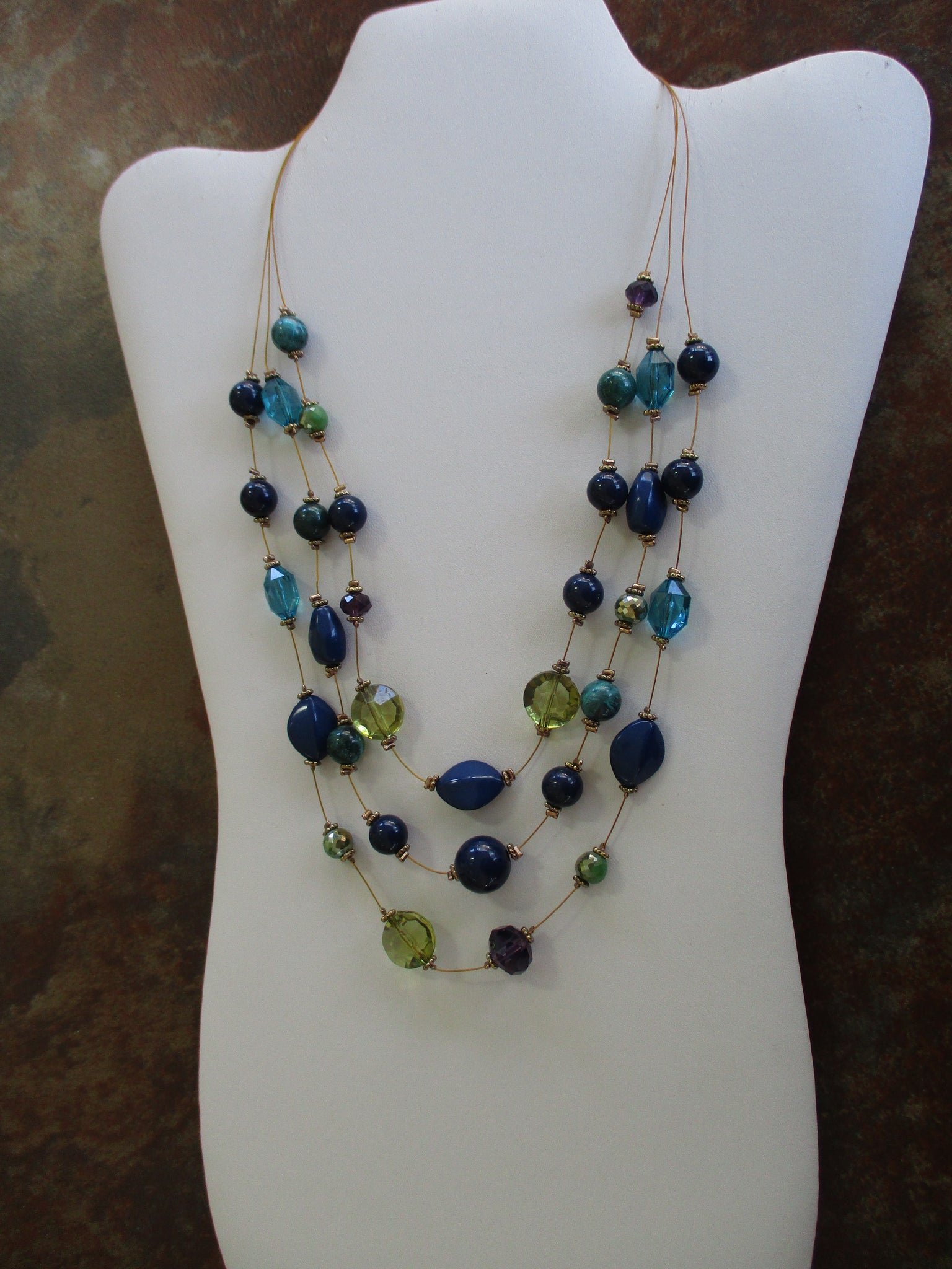 3 Row Gold Wire Multi Blue Green Gold Beads Necklace (N1273)