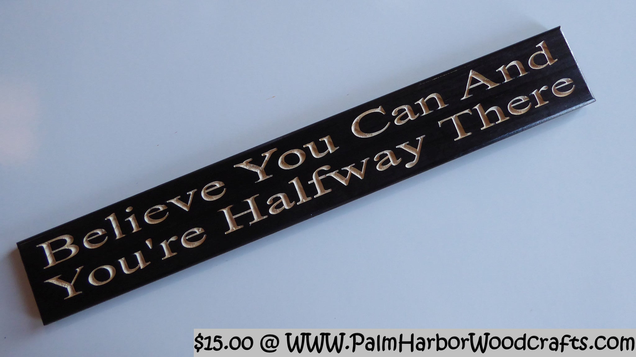 A 3.5 inch tall by 24 inch wide 3/4 inch thick carved wood sign. The back of the sign has keyholes for easy hanging.