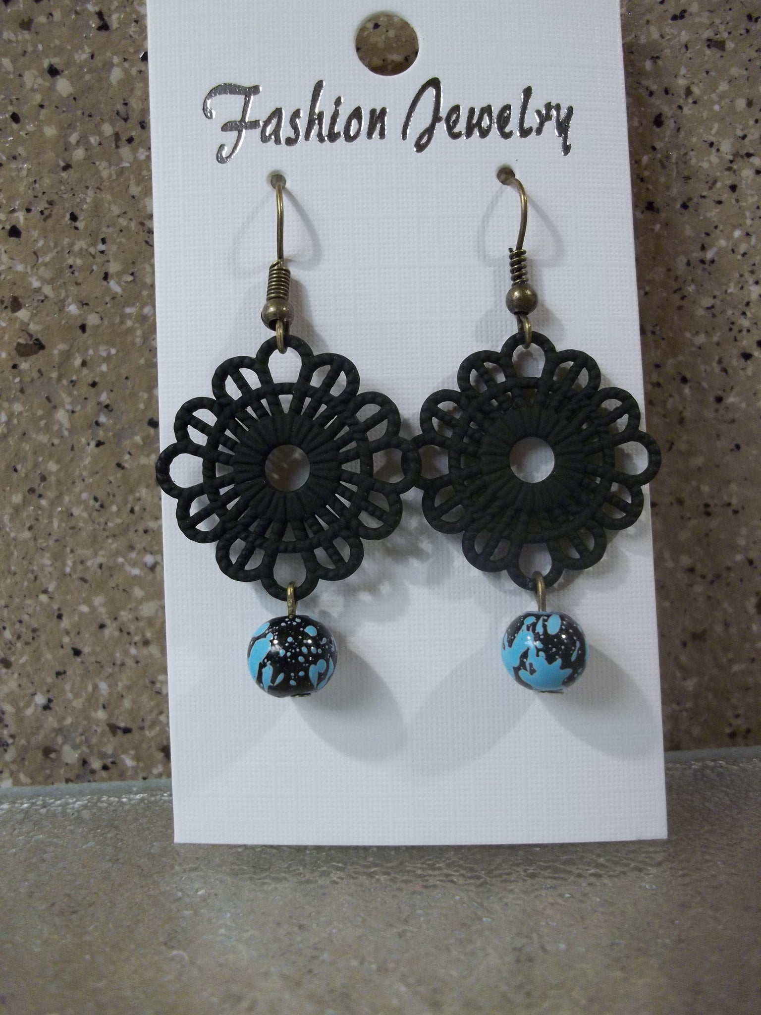 Bronze Black Metal Lace Glass Bead Earrings (E930)
