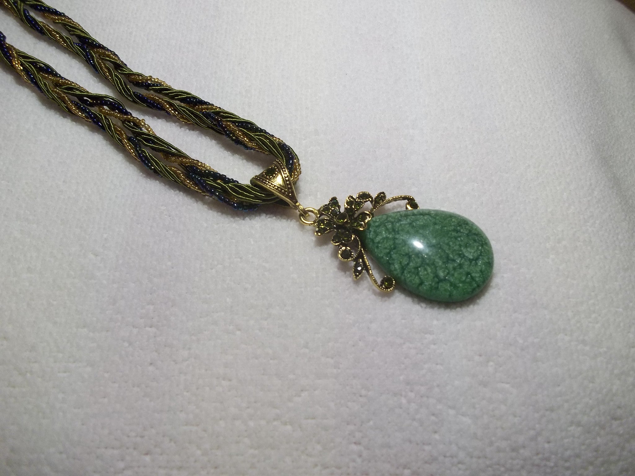 Green Braided Tear Drop Flower Necklace (N449)